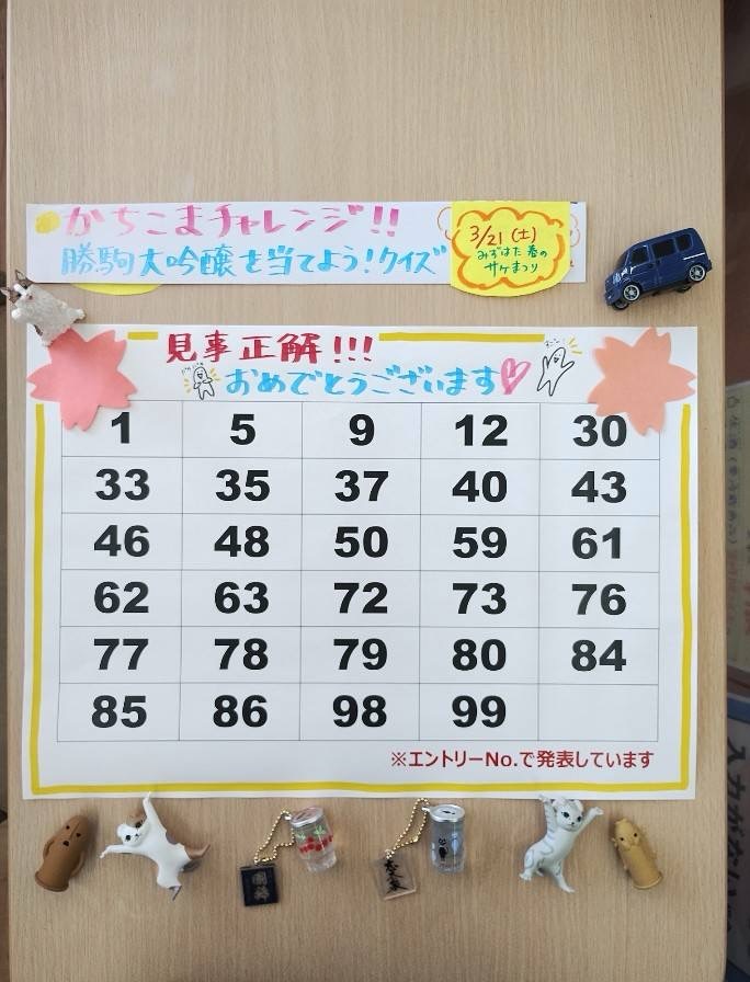 「みずはた春のサケまつり」「勝駒チャレンジ」ご参加いただいた皆様ありがとうございました♪見事!正解された方のエントリーNo.は画像のとおりです!おめでとうございますご来店の方は引取り期間内にご来店を。発送の方は4月12日(日)着でお送りします。何がなにだったか知りたい方は、店頭にてお尋ねください#飲みたい瞬間にこのお酒 #おいしいものを伝えたい#リカーポケットみずはた